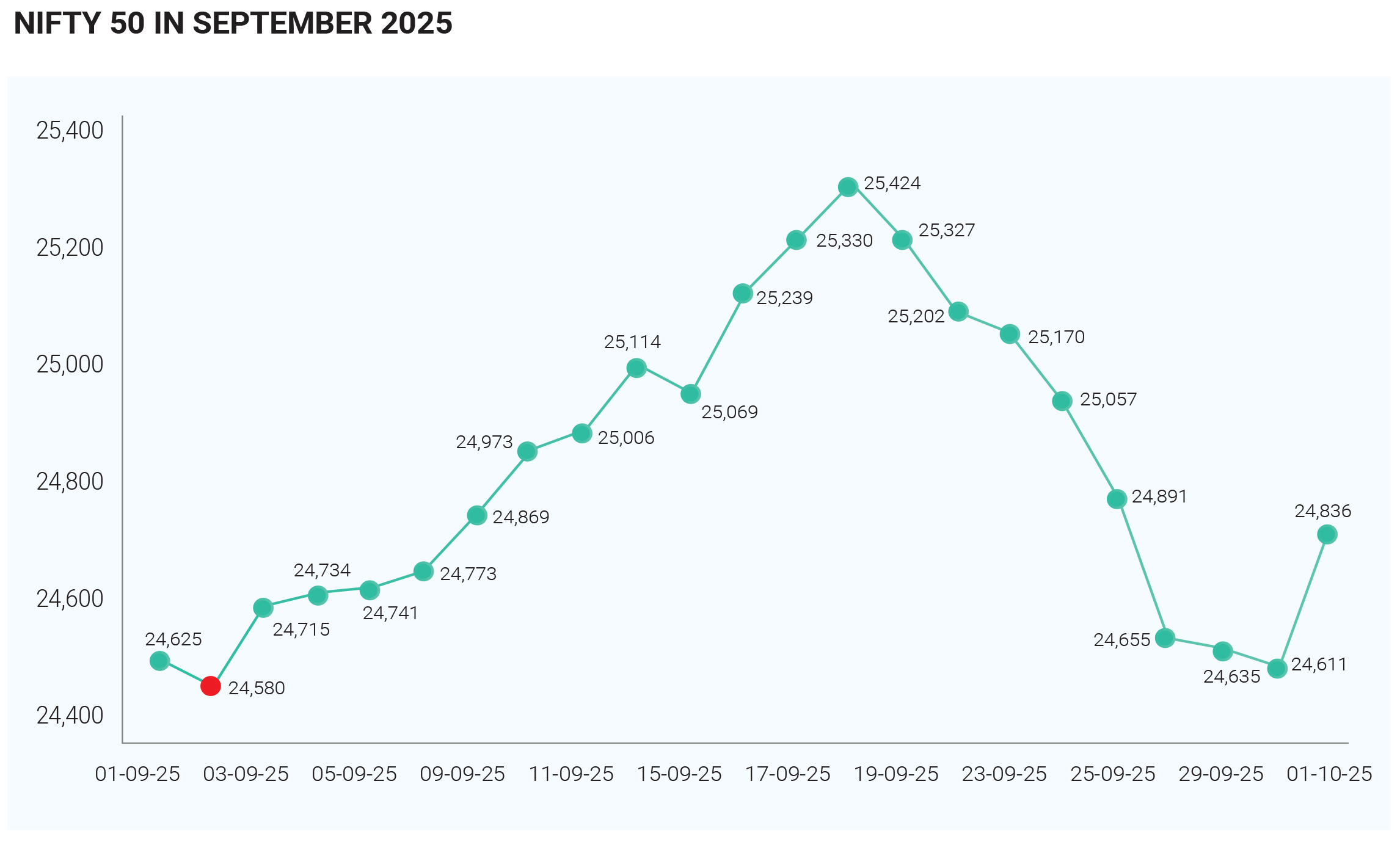 At the beginning of September, investor sentiment appeared upbeat. Both Sensex and Nifty climbed toward near-record highs, with the Sensex hovering between 80,300 and 81,900, while the Nifty traded between 24,700 and slightly above 25,100. This early rally was largely underpinned by optimism surrounding positive macroeconomic data, upbeat earnings expectations, and hopes of pro-growth policy reforms. However, this upward momentum failed to sustain itself as the month progressed, with the market losing steam in the latter half. Sectoral underperformance—particularly in IT, auto, and consumer-facing segments—combined with global uncertainty, led to a loss of gains and a shift in investor tone from bullish to defensive. By month-end, the Sensex and Nifty had posted monthly returns in the narrow range of 0.6% to 1.5%, highlighting the lack of decisive directional movement. Several factors contributed to this subdued performance. On the global front, ongoing trade tensions between the United States and India weighed heavily on sentiment. The imposition of 50% tariffs by the US on key Indian exports, including automobiles, textiles, and pharmaceuticals, sparked concerns over India’s export competitiveness and pressured related sectors. Simultaneously, continued uncertainty surrounding H-1B visa reforms in the US negatively impacted India’s IT sector—a long-time favourite among FIIs and a significant contributor to India’s services exports. The IT index fell sharply, registering a year-to-date decline of over 18% by the end of September, exacerbating selling pressure across the broader market. In addition, concerns about global economic health further fuelled caution. Investors were increasingly wary of a slowdown in the US and EU economies, sticky inflation, and the possibility of delayed interest rate cuts by the US Federal Reserve. These fears led to risk aversion among global investors, prompting them to exit emerging markets, including India. The Indian rupee also faced depreciation pressure, further eroding the appeal of Indian assets to foreign investors. As a result, FIIs were substantial net sellers in September, withdrawing between $2.5 billion and $2.7 billion (approximately ₹22,000 crore) from Indian equities, marking the third consecutive month of significant outflows. Domestically, the market narrative was shaped by a mix of positive structural reforms and ongoing macroeconomic concerns. One of the most significant developments was the announcement of GST rate cuts in late September. The government undertook long-awaited tax slab simplification, aimed at boosting consumption and improving ease of doing business. While the reform was welcomed from a long-term perspective, its short-term market impact was mixed. Uncertainty around the pace at which businesses would pass on these benefits to consumers limited the immediate positive reaction. Nonetheless, record GST collections for the month, touching ₹1.89 lakh crore, served as a testament to resilient domestic demand and strong compliance, offering some support to the markets amidst growing external pressures. On the economic front, the Asian Development Bank (ADB) revised India’s growth outlook upward to 6.5% for FY26–FY27, citing strong domestic fundamentals. This revision, coupled with robust manufacturing PMI data and steady credit growth in the banking sector, painted a relatively healthy picture of the domestic economy. Yet, this optimism was tempered by downward revisions in corporate earnings forecasts. Key sectors such as consumer durables, pharmaceuticals, and especially IT failed to meet analysts’ expectations, triggering profit booking and further dampening market sentiment. Defensive sectors like FMCG and PSU banks, which initially acted as safe havens, also saw selling pressure due to profit-taking and valuation concerns. The PSU banks and metals displayed relative resilience, supported by strong balance sheets, government capex, and continued demand from infrastructure and export markets. On the other hand, IT stocks bore the brunt of global policy and demand concerns. Consumer-facing sectors remained under pressure, weighed down by tepid festival-season demand and cautious investor positioning. Pharma stocks also struggled amid regulatory uncertainty in the US and weak margin guidance. However, midcaps and smallcaps saw selective investor interest, especially in financials, infrastructure-related plays, and new-age tech companies with domestic focus. Volatility throughout the month was driven not only by economic data but also by political and social developments. Early in the month, devastating floods in Punjab resulted in fatalities and widespread crop damage, contributing to concerns over food inflation and rural demand. Around the same time, reports of GST refund fraud and large-scale enforcement actions by tax authorities introduced an element of regulatory risk. Mid-September brought another inflationary data point, with retail inflation edging up slightly to 2.07% in August, raising fresh concerns about consumer purchasing power and demand recovery. The underlying theme for the Indian markets during September 2025 was the tug-of-war between structural domestic strength and persistent global fragility. On the one hand, India continued to benefit from strong tax collections, improving economic forecasts, and a supportive policy environment. On the other hand, markets were haunted by deteriorating global relations—particularly the US-India trade standoff—high FII withdrawals, and sectoral earnings disappointments. These opposing forces led to choppy trading patterns, with no clear breakout or breakdown across the major indices. To summarise September 2025 was a month of equilibrium for the Indian stock market—where the forces of growth optimism and policy reform clashed with the realities of global headwinds, earnings stress, and foreign investor retreat. Despite strong macroeconomic i